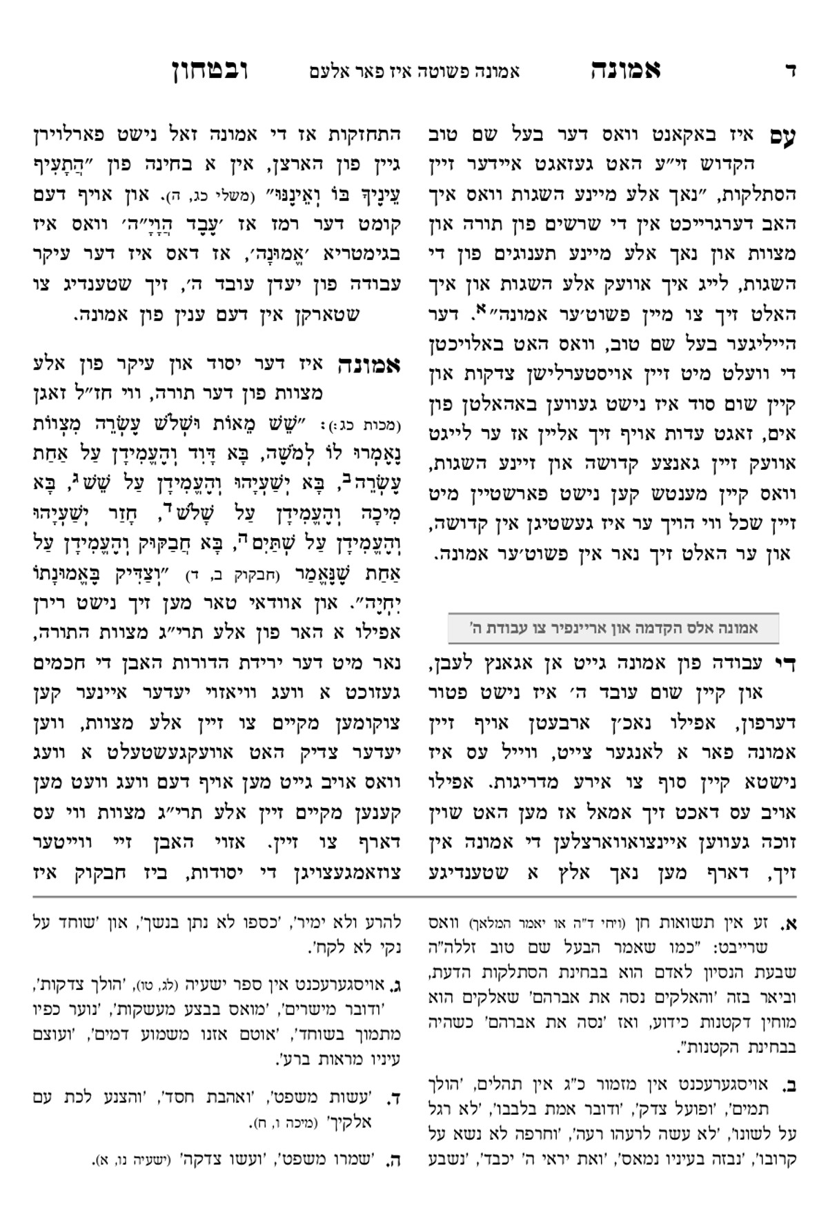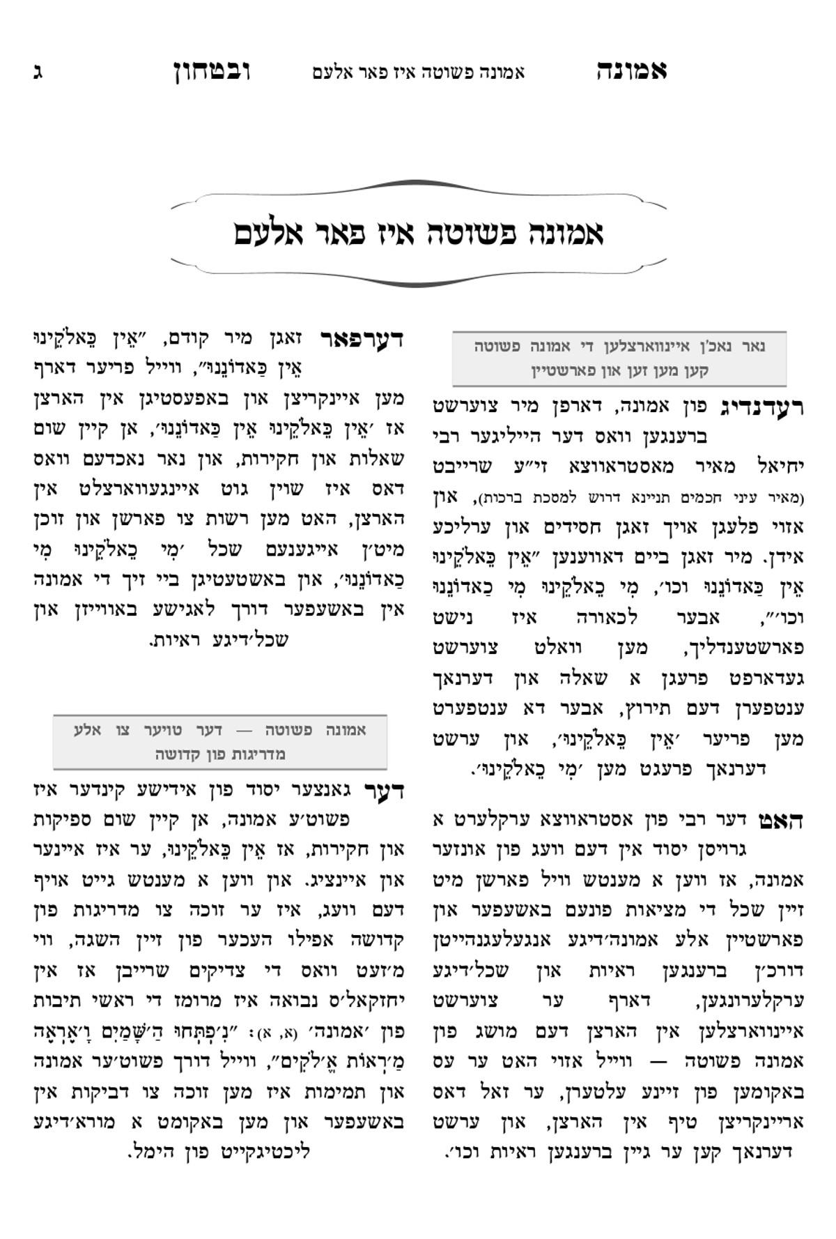 הייליגע שיחות און דברי חיזוק אויף ענייני מידת האמונה והביטחון אין דעם אייבירשטן, בפרט אין די קשיים און נסיונות פון אונזער דור. הייליגע ווערטער וואס זענען במשך די יאָרן ארויסגעקומען פון כ״ק מרן אדמו״ר רבי דוד חי אביחצירא שליט״א, און זענען געשריבן און מסודר געווארן בלשון ברורה און פארשטענדליכע פאר יעדער נשמה, איבערגעזעצט אויף לשון אידיש, מיטן ציל צו מחזק זיין, אויפוועקן און אויפהייבן די הערצער אין ליכט פון תורה און אמונה.