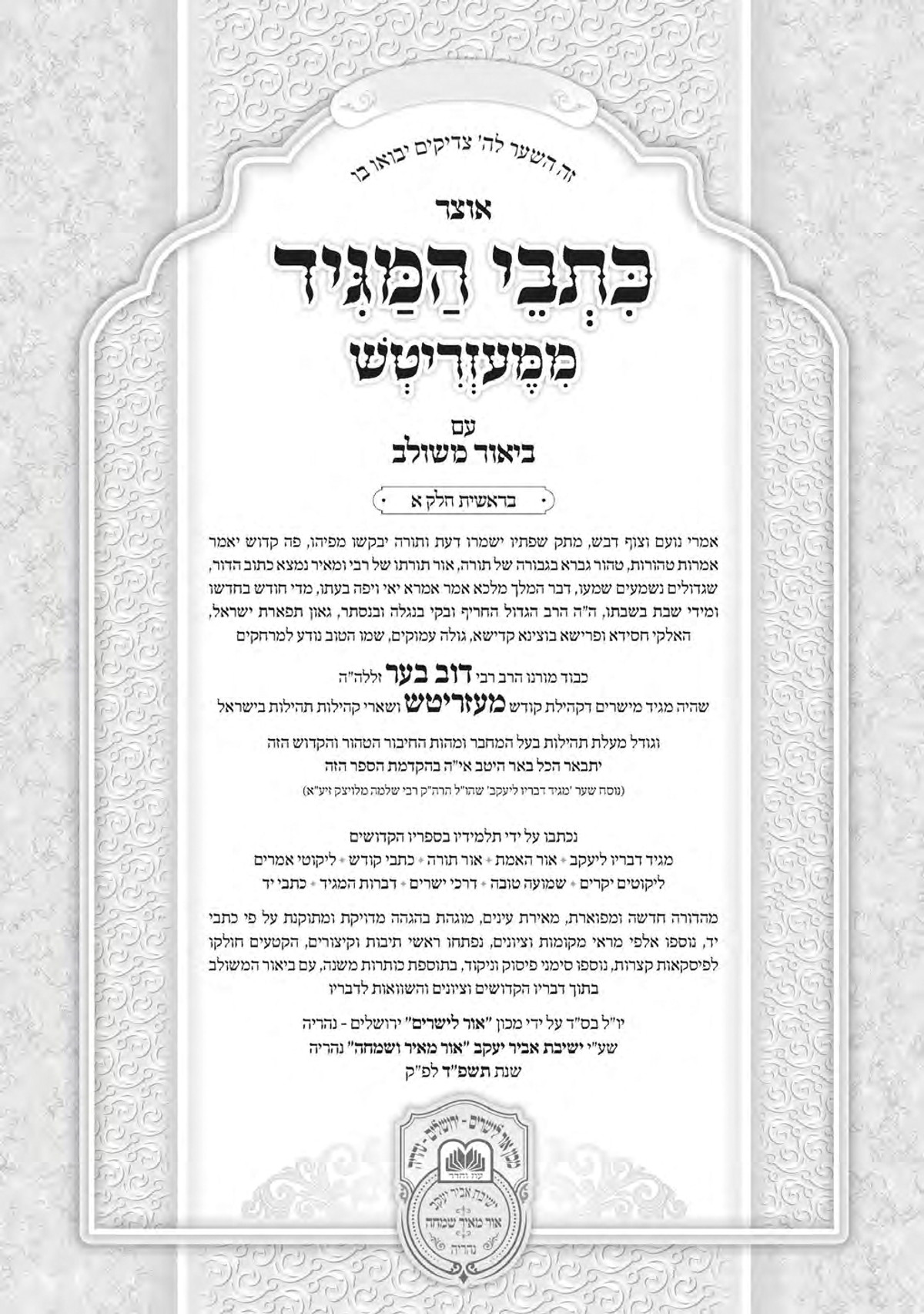 אוצר כתבי המגיד הקדוש רבי דב בער ממעזריטש זיע"א, ילקוט ומאסף כל המאמרים שנאמרו מפה קדשו ונכתבו ע"י תלמידיו בספריו הקדושים: מגיד דבריו ליעקב, אור האמת, אור תורה, כתבי קודש, ליקוטי אמרים, ליקוטים יקרים, שמועה טובה, דרכי ישרים, דברות המגיד וכתבי יד שונים.