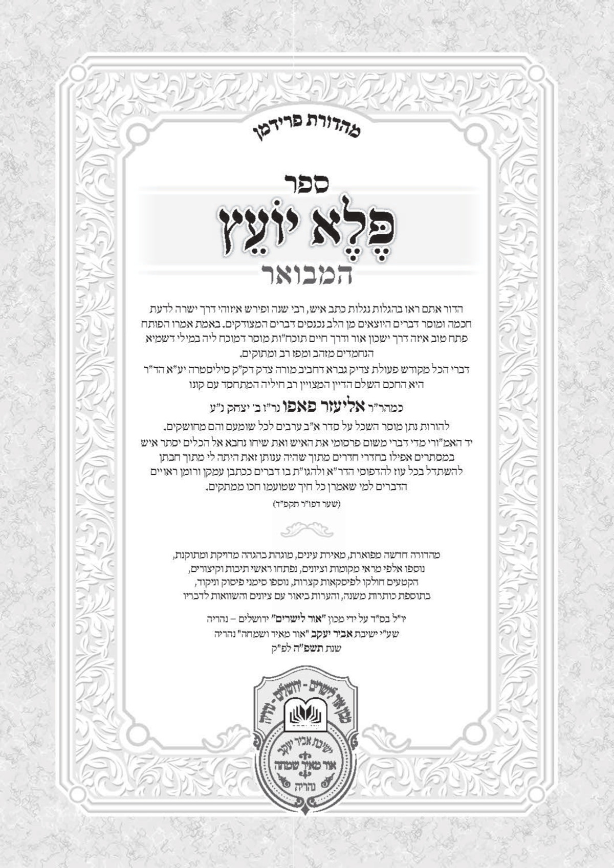 ספר פלא יועץ המבואר אשר חברו החכם הקדמון רבי אליעזר פאפו זיע"א. בספר נוסף מבוא נרחב לתורתו עם פרקי תולדות, ביאורים וציונים, כותרות משנה, מפתחות. בסוף הספר נדפס הספר אלפא ביתא מאת הרה"ק רבי צבי הירש מנדבורנה זיע"א, כפי שהדפיס רבינו המחבר, תוך שכותב כי מי שישקוד על הקונטרס לקוראו פעם בשבוע, או פעם בחודש, ימצא חיים.