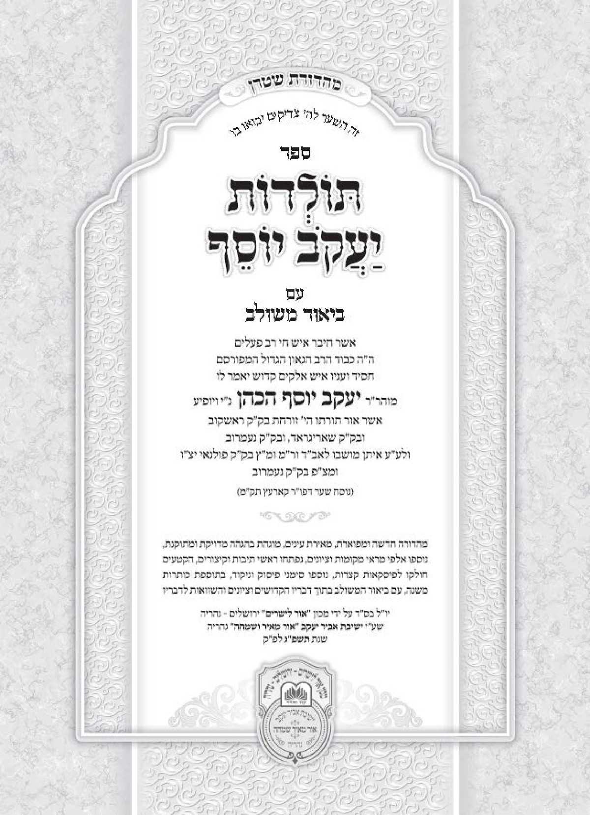 'תולדות יעקב יוסף' להרה"ק רבי יעקב יוסף מפולנאה זיע"א, על התורה ומועדים, במהדורה חדשה ומפוארת. עם ביאור משולב בתוך דברי רבינו המחבר, כדי להועיל להבנת הדברים, ובתוספת הערות וציונים. כל הספר הוגה עפ"י דפוסים ישנים, עם הוספות ותיקונים רבים. נסדר מחדש, עם חלוקה לקטעים, סימני פיסוק, כותרות לכל קטע. וכל אלו נסדרו בכלי מפואר, כמיטב ספרי 'ממלכת התורה עוז והדר'.